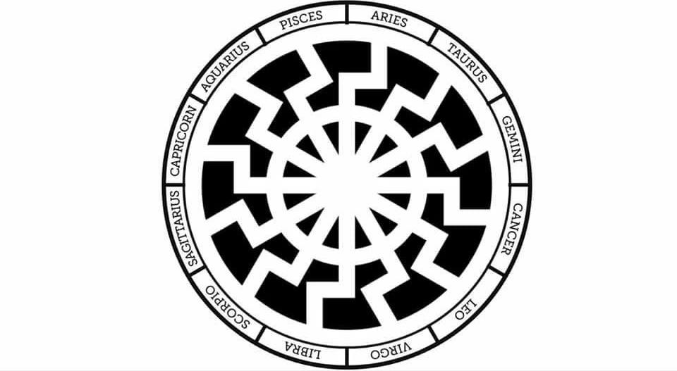 1. Det sorte solsejl eller solhjulet består af tolv radiale Sig-runer.
