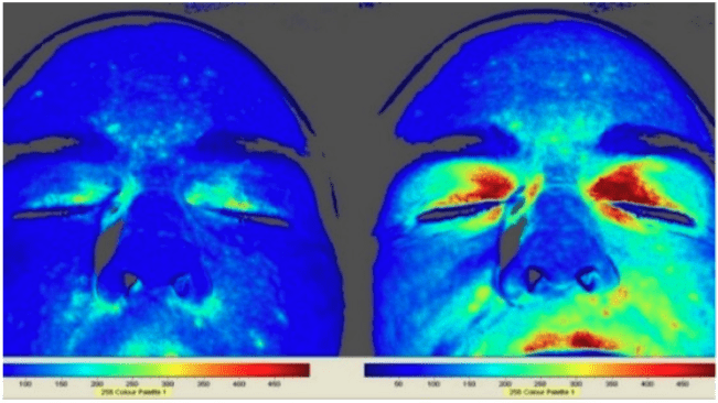 i ansigtet allerede efter 20 minutters #grounding var øget (billede: mørkeblå = laveste cirkulation,